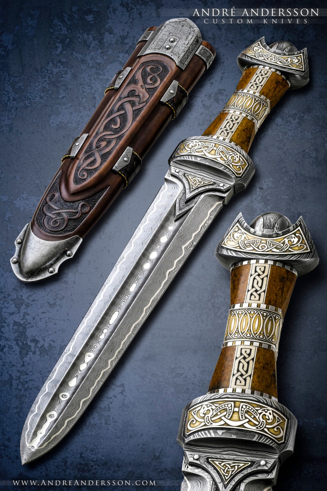Work from 2011 | André Andersson Custom Knives – Handmade damascus dagger with mammoth bone handle and engraved mammoth tusk inlay. Guard of Damascus steel and etched silver details with gold plating. Rawhide leather sheath with viking pattern.