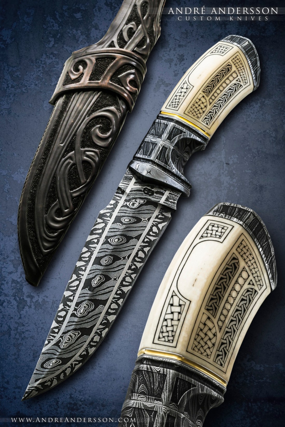Work from 2012 | André Andersson Custom Knives – Multibar damascus blade with twist damascus bolster. Engraved mammoth handle and leather sheath. Engravings by Rickard Perman.