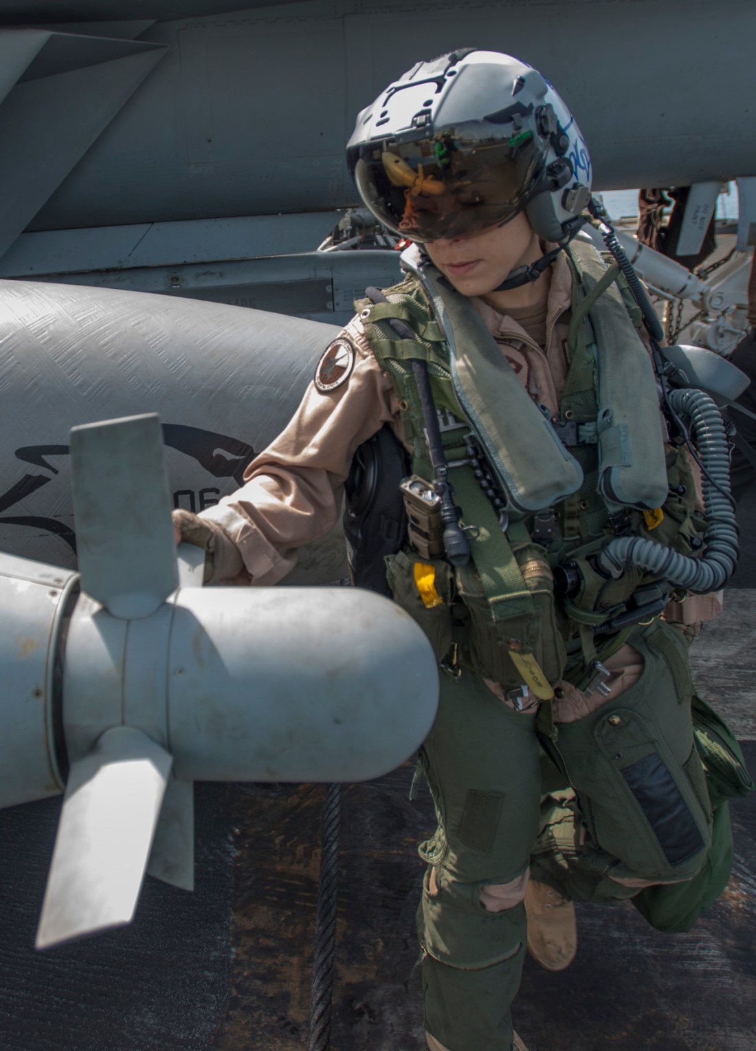 Lt. Cmdr. Kristen Levasseur of Electronic Attack Squadron (VAQ) 139 âCougarsâ conducts a pre-flight inspection on an EA-18G Growler on the aircraft carrier USS Carl Vinson (CVN 70) flight deck.