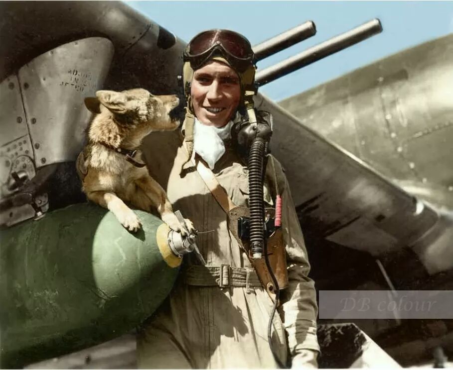 John W. “Wild Bill” Crump and “Jeep” pose for a photo next to Bill’s P-47 Thunderbolt of 360th Squadron, 356th Fighter Group, 8th Air Force. Jeep is laying on a 500 lb bomb.